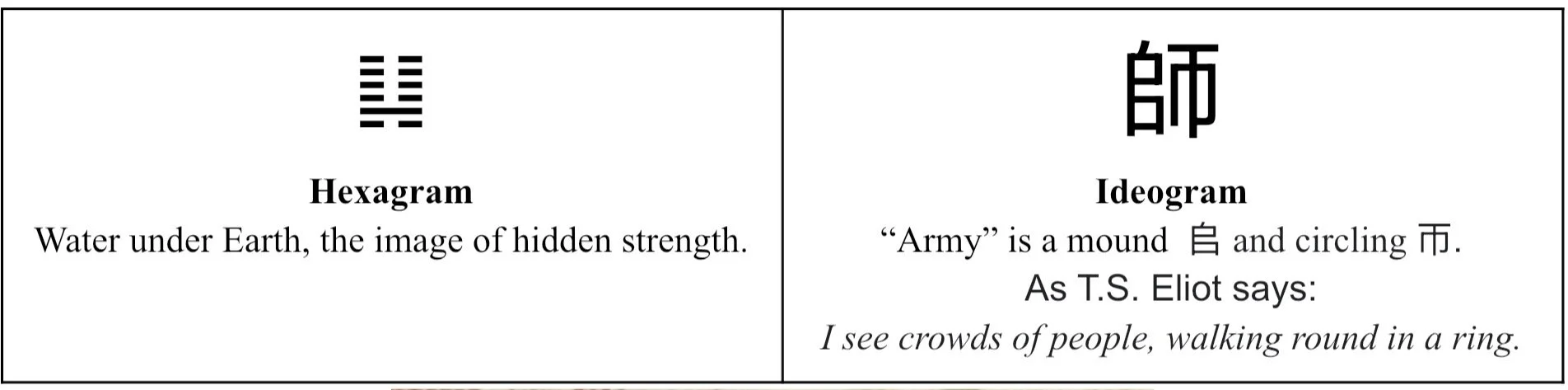 In this hexagram, we see the image of earth over water. It is something simple atop something dangerous, so in this way we are given the image of the Army. Consider revolutions in which simple folk become warriors. Naturally, this hexagram depicts an aquifer, or an underwater reservoir - a great resource hidden underground.