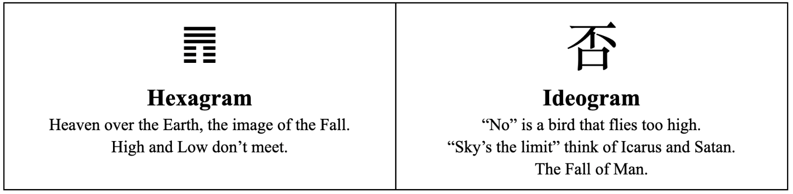 In this Hexagram we are given the image of the Fall itself. The Paradise of our previous Hexagram has returned to the “natural state” where Heaven is firmly above, and Earth is firmly below. The ideogram is the word for “No” and meant “Evil” in the past. A perfect balance to the affirmative “Good” of the previous hexagram;. the image of a thing falling. The text tells us what to do in this fallen state.