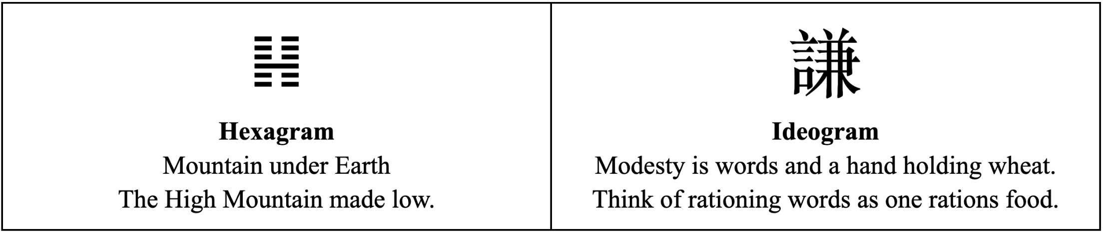 In this hexagram, we see the high making itself low. The image is that of a mountain buried under the earth. This is the colossal pyramids covered by the sands of time, a beautiful statue covered in dirt. It is also the nature of wisdom, for the ideogram shows us modesty as rationed words - someone who does not make a show of themselves, but hides their immense power.