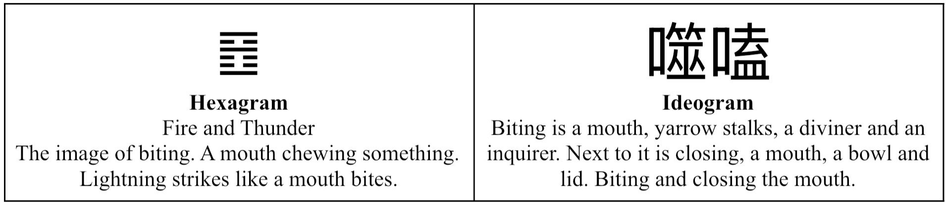 In this hexagram we see the image of a mouth, with the solid lines on the top and bottom as the lips, the broken lines as the teeth, and the solid line in between as a thing being bitten. It is thunder below the sun, a solar flare or a sudden lightning strike. The ideogram provides an image of biting, with one character relating to “biting questions” or “biting words”, and the other directly to eating.