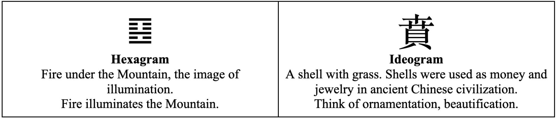 The hexagram gives us the image of fire at the foot of a mountain, and the resulting beauty and illumination. The ideogram shows grass, and a cowrie shell - the currency of ancient China, Africa, and India. Just as gold was used for both money and jewelry, so too were cowrie shells. The image is that of a cowrie shell necklace; something to make the face shine.