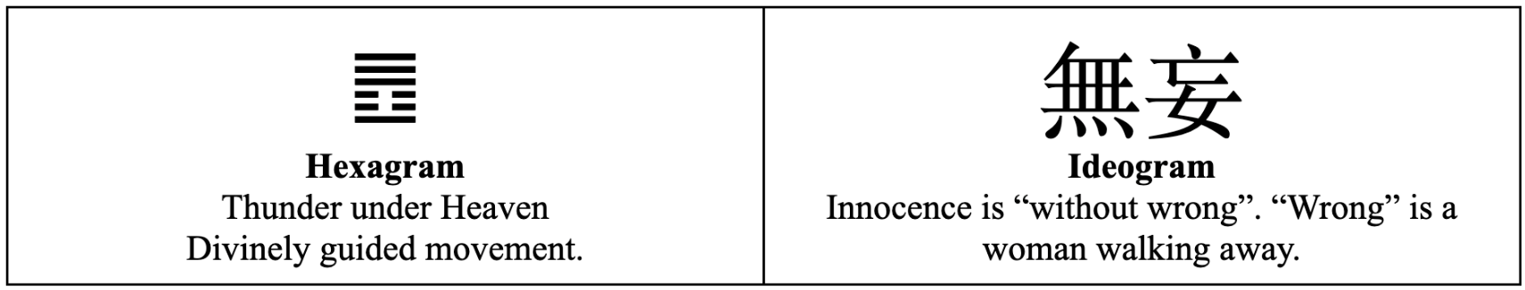 Here, we have the image of Thunder coming down from Heaven. The ideogram is directly “without wrong”, thus the image of natural innocence and foolishness. When lightning strikes a beautiful old tree or burns down a building, it is like an animal that stings or bites: there is no morality in nature. This is the state of Adam before the fall, who has not yet eaten the fruit of the Tree of Knowledge of Good and Evil.