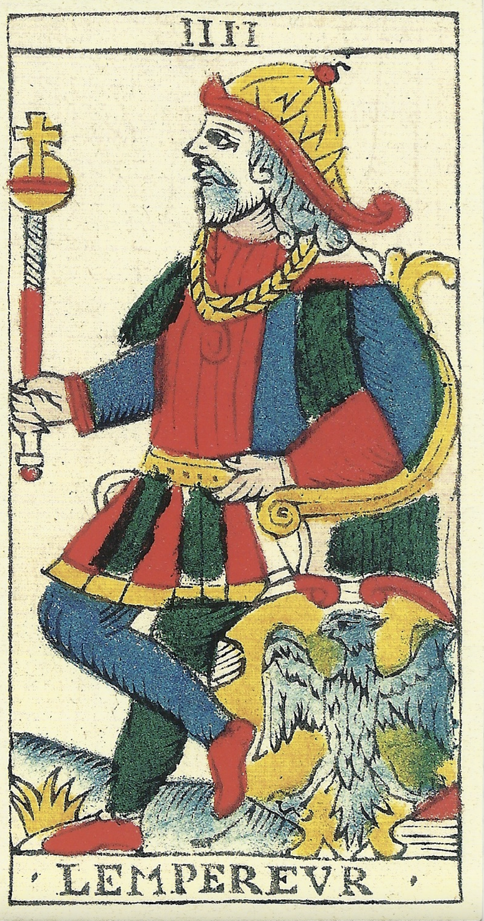 In Marseille, we once again find the Emperor older, with gray hair and a beard. He has a golden cross necklace, a crown that appears like fire, and a scepter bearing the Globus Cruciger. A shield bearing an eagle lays at his cross feet.