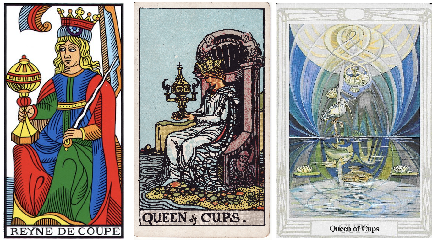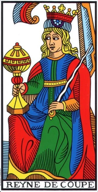 In Marseille, we have another matrix of cups, three by three, around which vegetation grows. At the bottom row of cups, the plants are wilting, atop they are growing strong. Qabalistically, the card is the ‘Foundation of the Queen’.