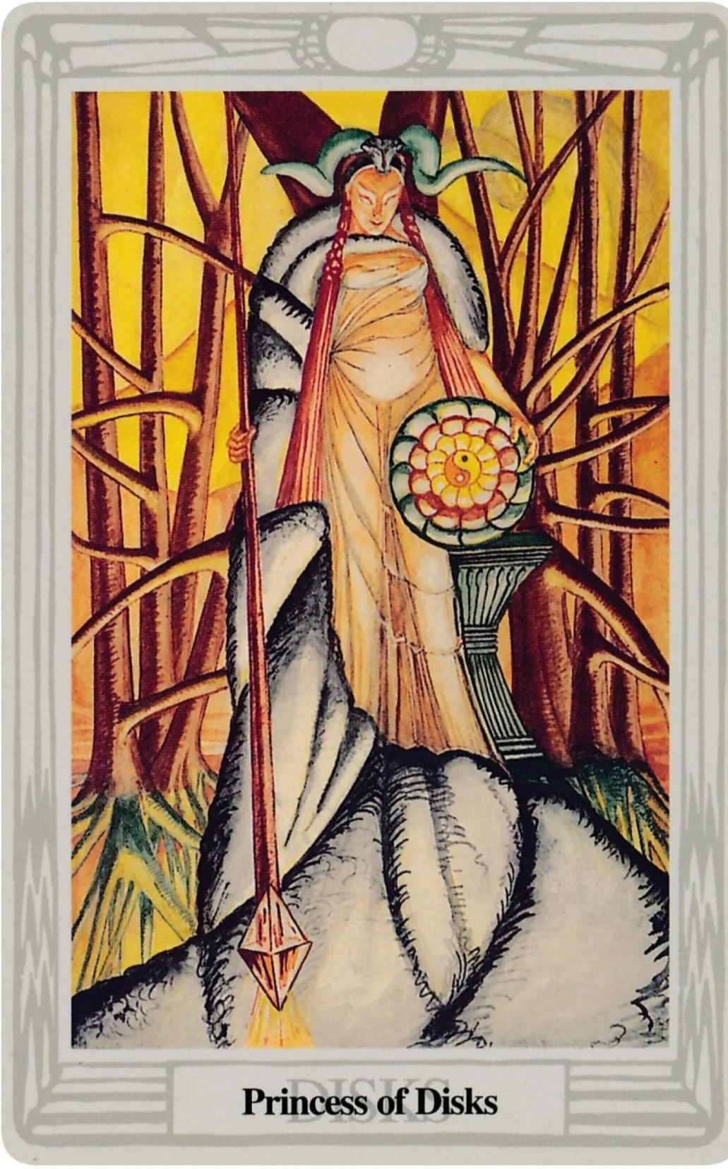 In Thoth, the Princess wears a diaphanous gown and a great fur. She is crowned by a goat’s skull. Her disk is a flower whose center is a Tajitu, a Yin and Yang symbol. She holds a scepter, with its crystal base towards the ground. She smiles, looking down at her pregnancy and blossoming disk.